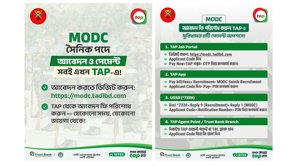 Both application submission and fee payment for MODC Sainik Recruitment can be completed easily through TAP. No need to stand in queues—apply online and pay anytime, from anywhere!